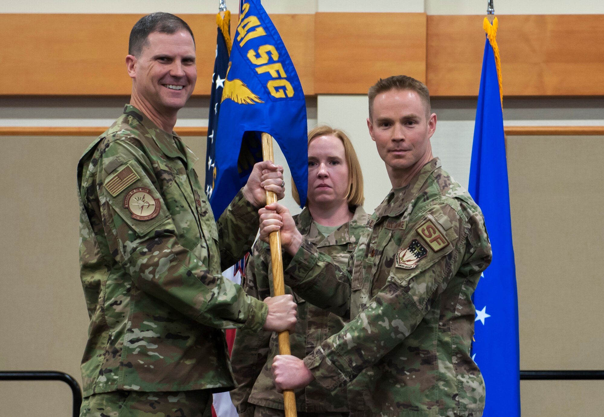 Maj. Brian Gilliam, right, accepts command of the 741st Missile Security Forces Squadron from Col. Aaron Guill, 341st Security Forces Group commander during a change of command ceremony June 4, 2019, at the Grizzly Bend on Malmstrom Air Force Base, Mont. Guidon bearer Master Sgt. Ruth Salender, 741st MSFS first sergeant, looks on. (U.S. Air Force photo by Devin Doskey)