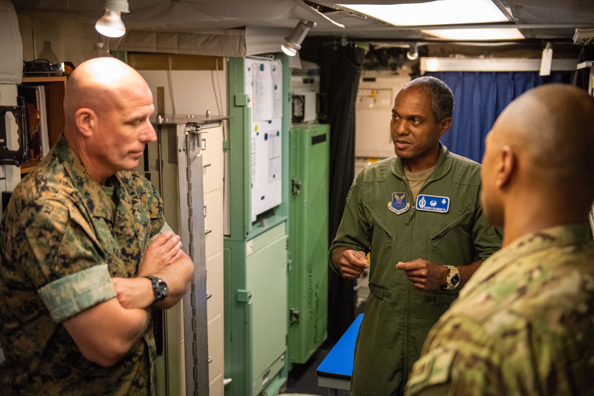 U.S. Marine Corps Sgt. Maj. Howard Kreamer, senior enlisted leader of U.S. Strategic Command, receives a briefing from Lt. Col. Joseph Shannon, 10th Missile Squadron commander, about launch control capsule operations and mission importance Sept. 8, 2022, near Great Falls, Mont. During his visit, Kreamer met with Airmen from several career fields to learn about mission needs and successes. (U.S. Air Force photo by Staff Sgt. Tristan Truesdell)