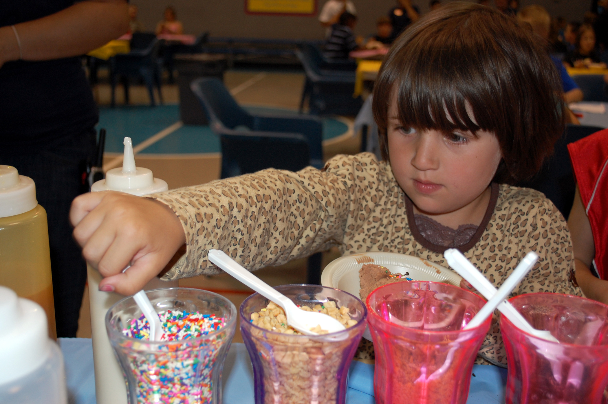 Little Warrior Haleigh, 5, grabs a spoonful of multicolored sprinkles for her bowl of ice cream during Brainfreeze July 22. A variety of toppings were provided to include peanuts, cookies, cherries, M&M’s, crushed candies and an assortment of syrups. (U.S. Air Force photo/Airman 1st Class Kristina Overton)