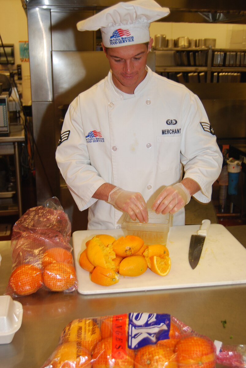 Senior Airman David Merchant, 12th Missile Squadron chef, squeezes a couple of oranges to make orange glaze for his team's signature dish at the Warrior Chef competition June 17. The common ingredient for this compeition was fresh oranges. (U.S. Air Force photo/Airman 1st Class Kristina Overton)