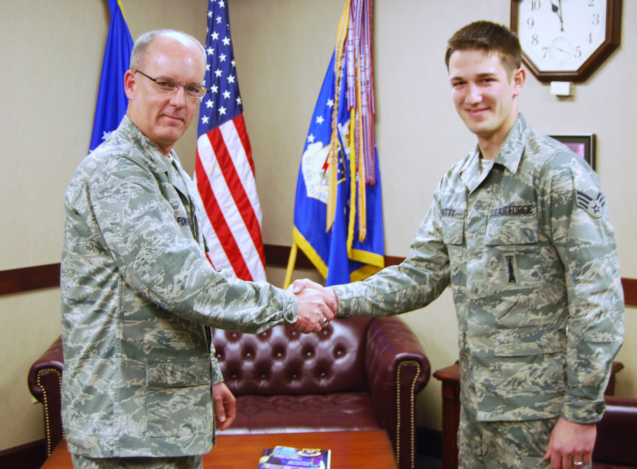 Senior Airman Joshua Beatty, 341st Missile Maintenance Squadron missile maintenance technician, was coined by Col. Michael Fortney, 341st Missile Wing commander, for completing his 100th safe payload transporter technical operation April 16. (U.S. Air Force photo/Airman 1st Class Kristina Overton)