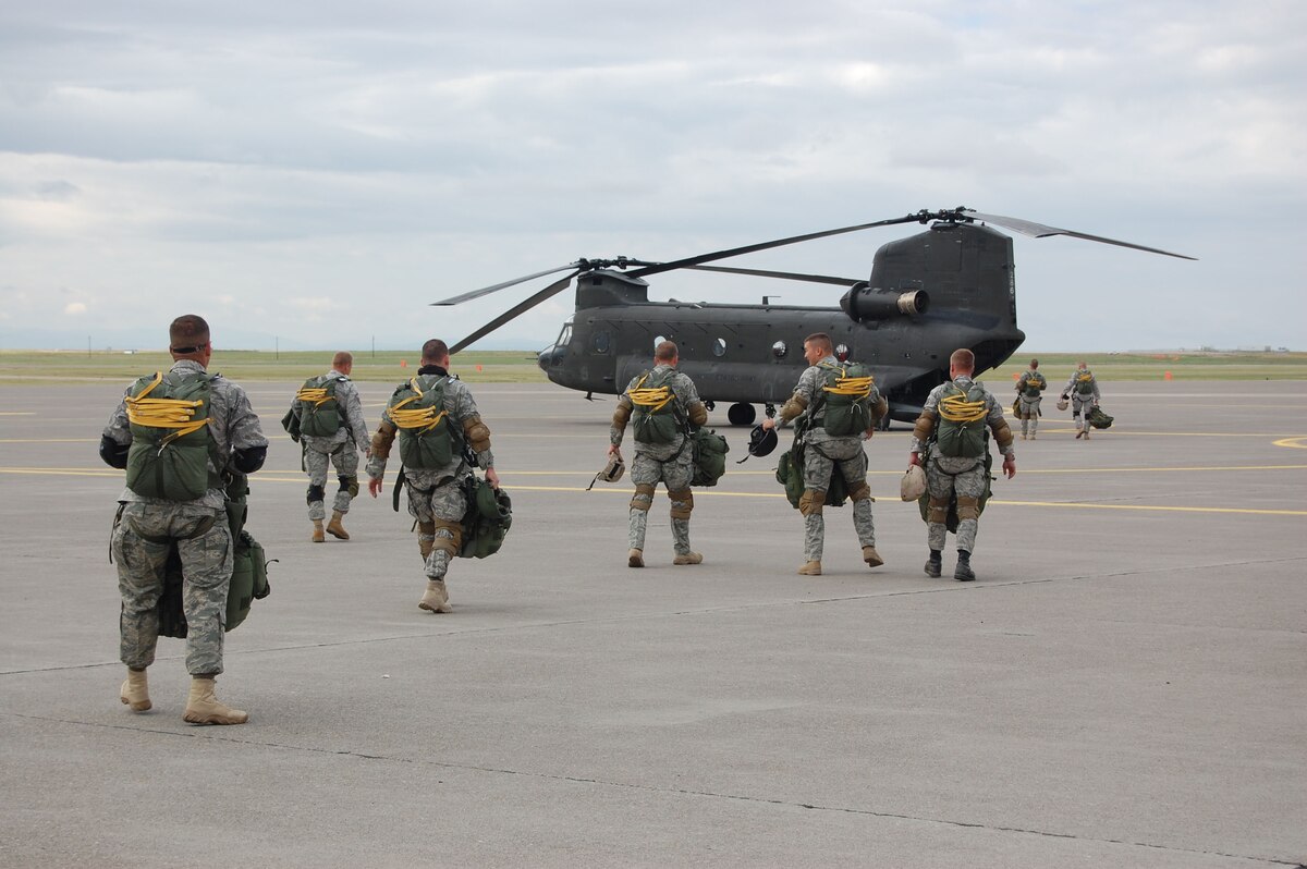 Tech. Sgt. Charles Hardy receives assistance from fellow 819th RED HORSE Squadron airborne team member, Staff Sgt. John Sinner, prior to a parachute jump out of a Chinook helicopter July 23. Roughly 11 members of the 819th RHS airborne team performed jump training at Malmstrom Air Force Base with aerial assistance from the Montana Army National Guard. The parachutes weigh about 40 pounds each and their backpacks and gear weigh between 60 to 75 pounds. (U.S. Air Force photo/Senior Airman Eydie Sakura)