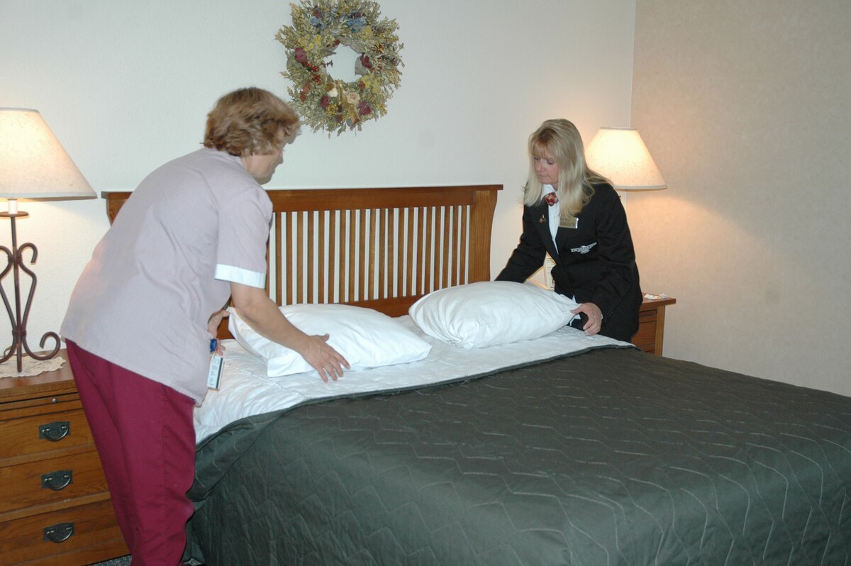 Veronica Davison, 341st Services Squadron housekeeping manager, right, and Sharon Torres, 341st SVS housekeeper, make a bed at the Malmstrom Inns and Suites Nov. 20. Ms. Davison was awarded the 2007 Innkeeper of the Year award for the Air Force Nov. 10 in New York City. (U. S. Air Force photo/Senior Airman Eydie Sakura)