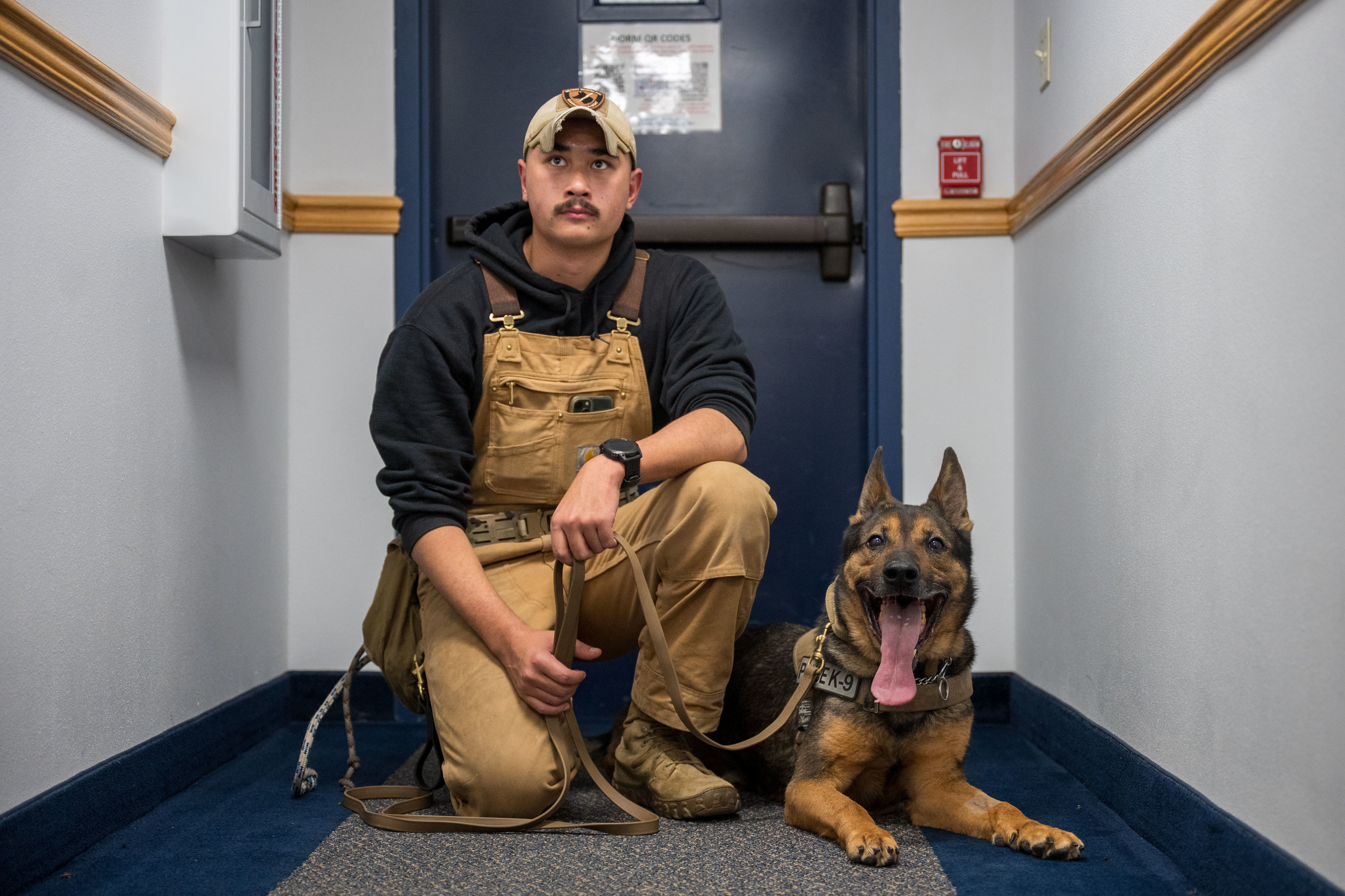 U.S. Air Force Senior Airman Jared Giddens, 341st Security Forces Squadron military working dog handler, and MWD Paul receive feedback during a MWD detection training at Malmstrom Air Force Base, Montana, Nov. 7, 2025. Continuous training builds a bond between handlers and their military working dogs, leading to a more efficient execution of their duties. (U.S. Air Force photo by Airman 1st Class Jack Rodriguez Escamilla)
