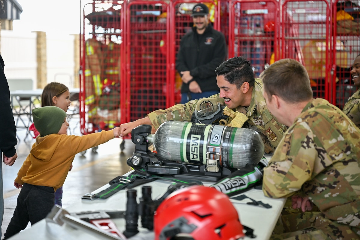 Master Sgt. Samantha Tremblay, 341st Civil Engineer Squadron assistant fire chief, and David Sidle, 341 CES fire department fire captain, pose for a photo during a fire department open house Oct. 11, 2025, at Malmstrom Air Force Base, Mont. October is fire prevention month and following tradition, the Malmstrom fire department hosted an open house for the base community to attend. (U.S. Air Force photo by Airman 1st Class Jack Rodriguez Escamilla)