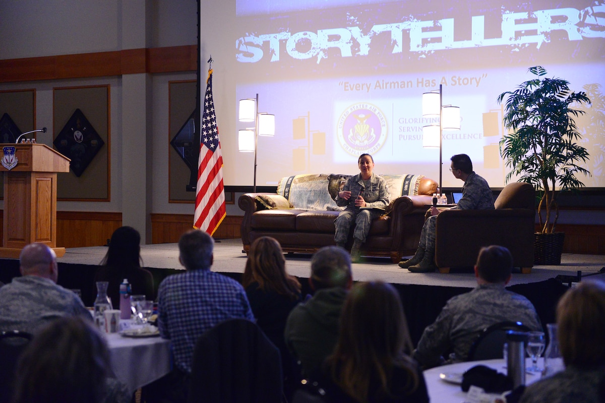 Master Sgt. Reina Voss, 341st Missile Wing judge advocate law office superintendent, shares her story about alcoholism at the Storytellers event held April 1, 2016, at Malmstrom Air Force Base, Mont. Storytellers is a resiliency event held biannually at the base, where individuals are able to share their stories to inspire and empower others during tough times. (U.S. Air Force photo/Airman Daniel Brosam)