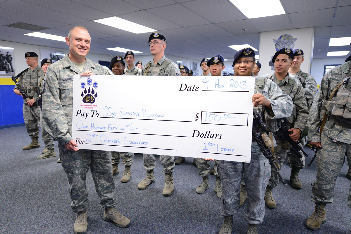 Staff Sgt. Shanace Robinson, 341st Missile Security Forces Squadron member, right, receives a check from Master Sgt. Gregory Aderhold, 341st Security Support Squadron logistics flight chief, during 341st MSFS guardmount at Bldg. 500 on Aug. 9. Robinson was the NCO recipient of the Big Sky Top 3 Association second quarter scholarship for her essay on fraud, waste and abuse. Senior Airman Matthew Noble, 341st Munitions Squadron member, received a scholarship in the Airman category. The Top 3 Association offers quarterly scholarships to airman basic through tech. sgt. To qualify for the scholarship, Airmen must be enrolled in an accredited college. The third quarter scholarship essay topic is “Is the Air Force physical training program fair?” and is due Sept. 15 to Aderhold. (U.S. Air Force photo/Senior Airman Katrina Heikkinen)