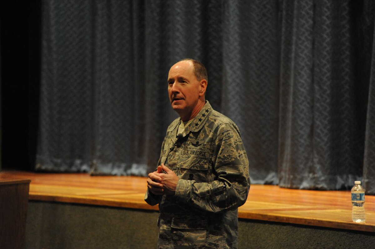 General C. Robert Kehler, U.S. Strategic Command commander, presents a commander’s coin to Senior Airman Brandyn Neuhaus, 741st Missile Security Forces Squadron member, for superior service and a job well done. Kehler recognized exceptional Airmen from around Malmstrom during his tour of the base July 31. (U.S. Air Force photo/John Turner)