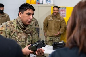 April 14, 2022 Emergency management, FBI joint-training Senior Airman Alberto Rosendo-Diaz, 341st Security Operations Squadron tactical response force defender, gives a rope-tying demonstration to FBI agents and Malmstrom Airmen March 8, 2022, during a joint-training event at the emergency management warehouse on Malmstrom Air Force Base, Mont
