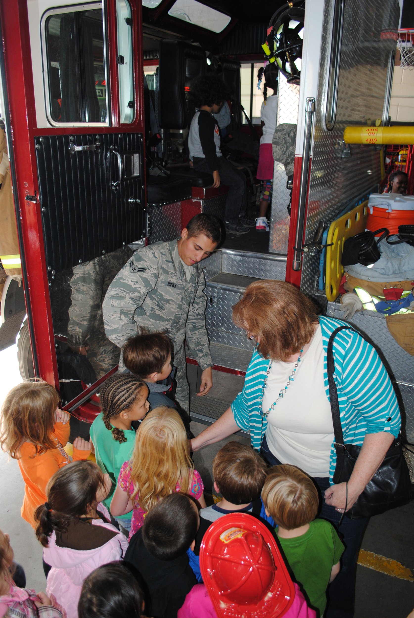 Airman 1st Class Cody Ripka, 341st Civil Engineer Squadron fire fighter, helps the students up onto the fire truck so they can walk around inside. (U.S. Air Force photo/Airman Cortney Paxton)