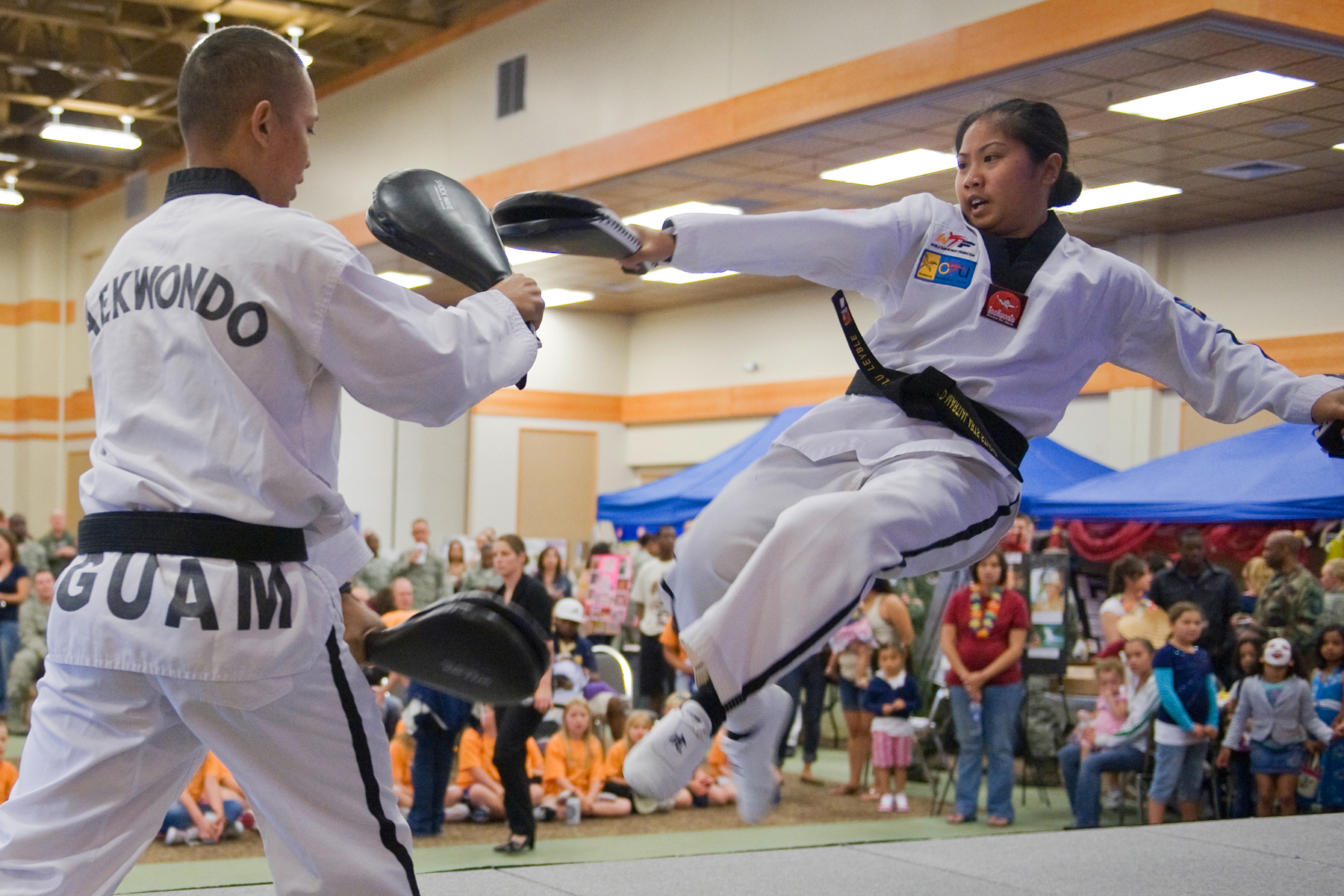 Airman 1st Class Marilou Leyble, 341st Logistics Readiness Squadron vehicle management and analysis technician, and Senior Airman D. J. Rodriguez, 16th Munitions Squadron member, demonstrate Taekwondo techniques at the Multicultural Fair July 22 held at the Grizzly Bend. (U.S. Air Force photo/Beau Wade)