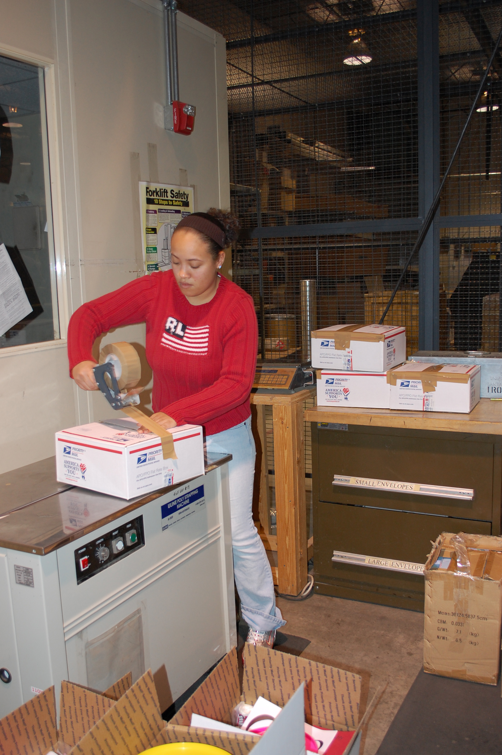 Airman 1st Class Carolmesha Stroud, 341st Logistics Readiness Squadron, tapes up care packages Dec. 5 that will be sent to deployed Montana military members. (U.S. Air Force photo/Valerie Mullett)