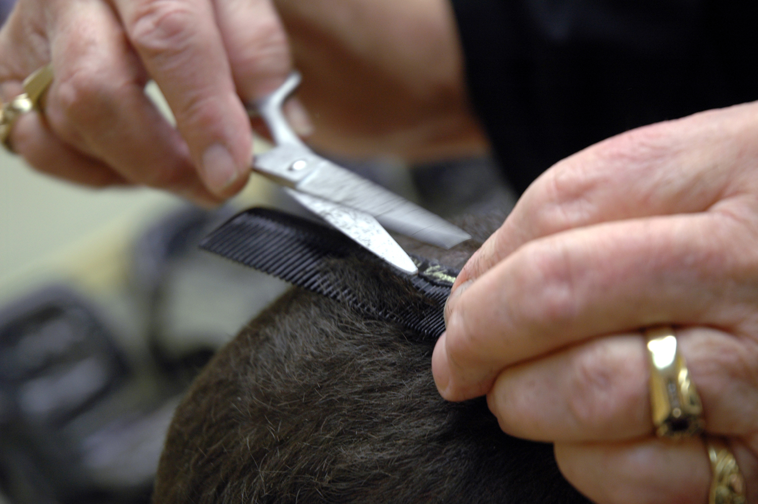 Jim Thul's hands manuever scissors and a comb through a customer's hair at the base barber shop March 31. (U.S. Air Force photo/Senior Airman Dillon White)